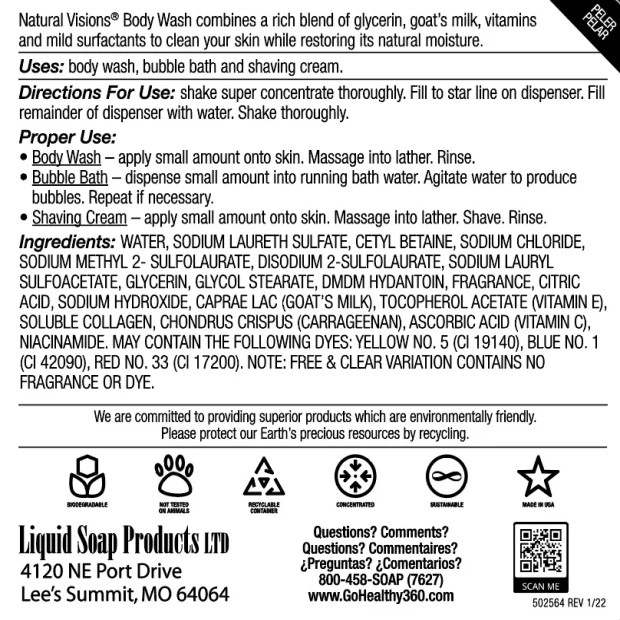 Ingredients: Water, Sodium Laureth Sulfate, Cocamidopropyl Betaine, Sodium Chloride, Sodium Methyl 2- Sulfolaurate, Disodium 2-Sulfolaurate, Sodium Lauryl Sulfoacetate, Glycerin, Glycol Stearate, DMDM Hydantoin, Fragrance, Citric Acid, Sodium Hydroxide, Caprae Lac (Goat's Milk), Tocopherol Acetate (Vitamin E), Soluble Collagen, Chondrus Crispus (Carrageenan), Ascorbic Acid (Vitamin C), Niacinamide. May contain fragrance and the following colorants: Red No. 6, Red No. 33, Yellow No. 5, Yellow No. 6, Blue No. 1. Note: Free & Clear variety contains no fragrance or dye.