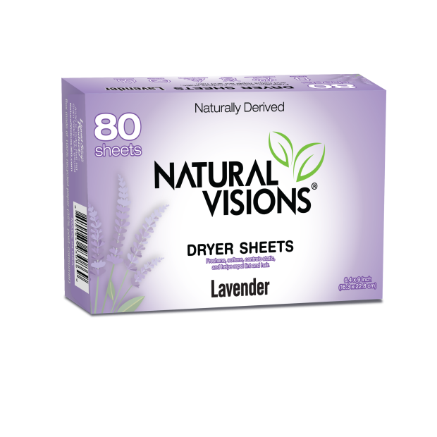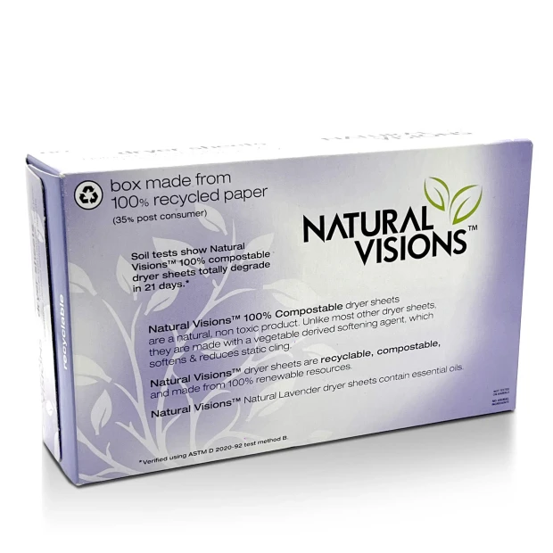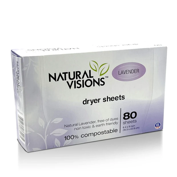 Natural Visions Lavender Dryer Sheets EARTH DELICATE 100 compostable dryer sheets are a natural non toxic product. Unlike most other dryer sheets, they are made with a vegetable derived softening agent, which softens and reduces static cling. One Box contains 80 sheets..