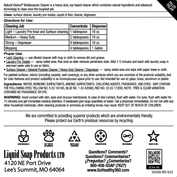 Attention: If this is the first time you are ordering this product, please be sure to also order the Multipurpose Cleaner 32oz Trigger Dispenser. NVXM32DNatural Visions Multipurpose Cleaner, crisply scented with pink grapefruit, is a heavy-duty soy-based cleaner, combining natural ingredients and advanced technology to clean even the toughest jobs. This ONE product is a surface cleaner, laundry pre-treatment, carpet & floor Cleaner, AND a degreaser.