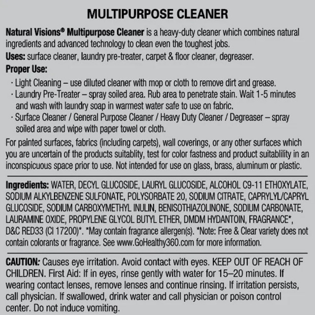 Natural Visions Multipurpose Cleaner is a heavy-duty citrus based cleaner which combines natural ingredients and advanced technology to clean even the toughest jobs. Use your Trigger Bottle Dispenser over and over again when you purchase our Natural Visions Extreme Concentrated Multipurpose Cleaner Liter. ONE Liter will mix up to SIXTY-FOUR 32oz. dispenser bottles of Multipurpose Cleaner.