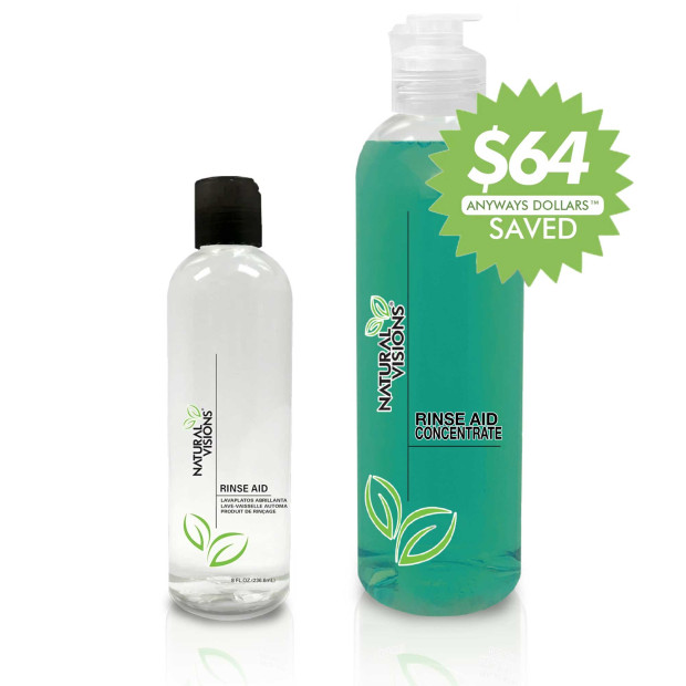 Natural Visionstm Rinse Aid helps keep dishes looking like new with regular use while fighting spots and residue for a crystalline shine. Food and water residues can redeposit on dishes during the rinse cycle, causing spots to remain. Natural Visions Rinse Aid is biodegradable, yet cuts through food and soapy residues leaving sparkling dishes, glasses and tableware. Superior drying action. Safe for septic systems. Prevents etching. Keeps your dishes looking like new. Simply fill your rinse agent compartment in your automatic dishwasher with diluted Natural Visions Rinse Aid and it is automatically dispensed in the rinse cycle every time you run your dishwasher.