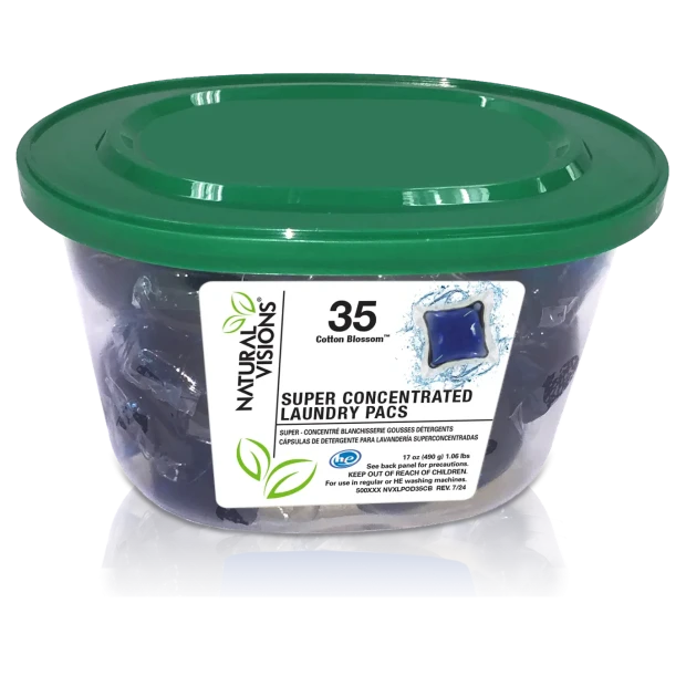 Natural Visions SmartPacs™ - Cotton BlossomNatural Visions Laundry Detergent SmartPacs™ deliver the power of concentrated liquid laundry detergent to leave your clothes clean and vibrant. This 35 count container is filled with individual use liquid pacs. One highly-concentrated SmartPac equals one load of laundry. Laundry SmartPacs are safe for all types of washing machines, including high efficiency HE front-loading washers and top-loading washing machines. Laundry SmartPacs are safe for septic systems when used as directed. This product contains no phosphates, nonylphenols, DEA or fillers. - Not For Cold Water UseItem #: NVXLPOD35CB.