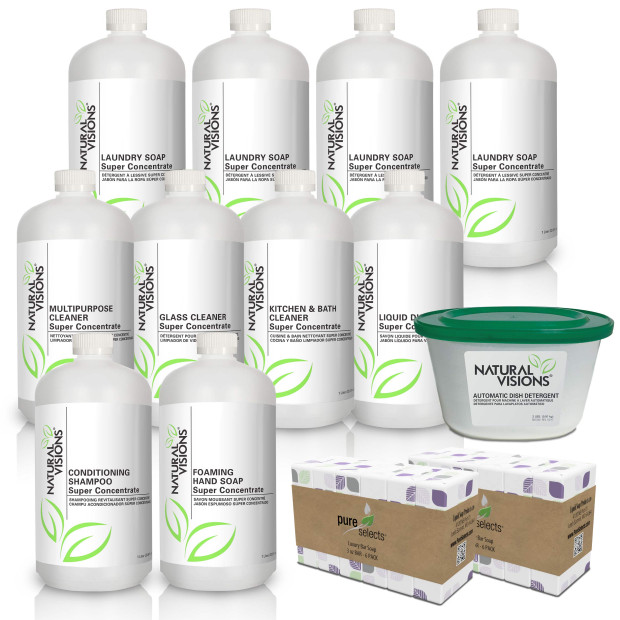 Natural Visions Home Conversion Pack These products match the Starter Pack you may have received.This Pack Includes:4Natural Visions Laundry Soap Liters Cotton Blossom, 1Natural Visions Automatic Dish Powder 2 lb Tub, 1 Natural Visions Foaming Hand Soap Liter Peaches & Cream, 1 Natural Visions Conditioning Shampoo Liter Rainforest,1 Natural Visions Liquid Dish Soap Liter Green Tea & Thyme, 1 Natural Visions Glass Cleaner Liter Lavender, 1 Natural Visions Multipurpose Cleaner Liter Pink Grapefruit, 12 Bars of Bar Soap will vary from Oatmeal bars to Green Tea Glycerin Bars, & 1 Natural Visions Kitchen & Bath Cleaner Citrus LiterItem #: NVXPICK12VP.