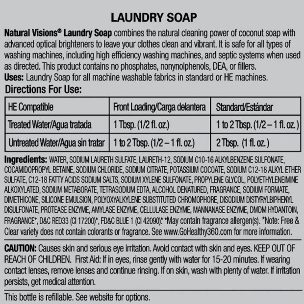 Natural Visions Laundry Soap combines the natural cleaning power of pure coconut soap with advanced optical brighteners to leave your clothes clean and vibrant. Natural Visions Laundry Soap is safe for all types of washing machines, including high efficiency, and septic systems when used as directed. Kind to your clothes, your body, and the earth, this product contains no Phosphates, Nonylphenols, DEA, Enzymes or Fillers.This 16 oz. bottle of Natural Visions Laundry Soap will wash up to 32 loads. Use your laundry soap dispenser bottle over and over again when you purchase our Natural Visions Super Concentrated Laundry Soap Liter. ONE Liter will mix up to Eight 16oz. dispenser bottles of fresh Laundry Soap.