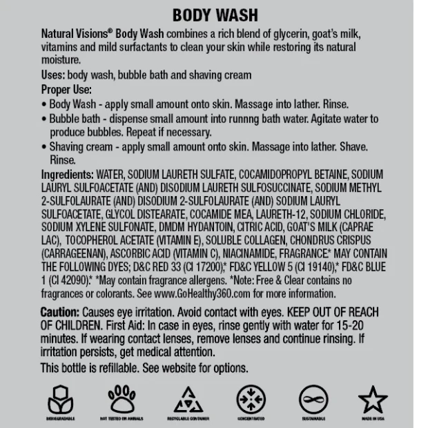 NV Body Wash Rain Forest- RTD Ready-to-Dilute Just Add WaterNatural Visions Body Wash combines a rich blend of fresh goats milk, coconut oil, glycerin and olive oil extracts to clean your skin while restoring its natural moisture, proteins, and vitamins. This is a READY TO DILUTE item. You just have to add water, cap it, and shake it. Please Note: This is only a 30-45 day supply of product To maximize your points, please check out the 33.8oz LITERS of product.Each LITER makes MULTIPLE dispensers.Item #: NVXBWRFDRTD.
